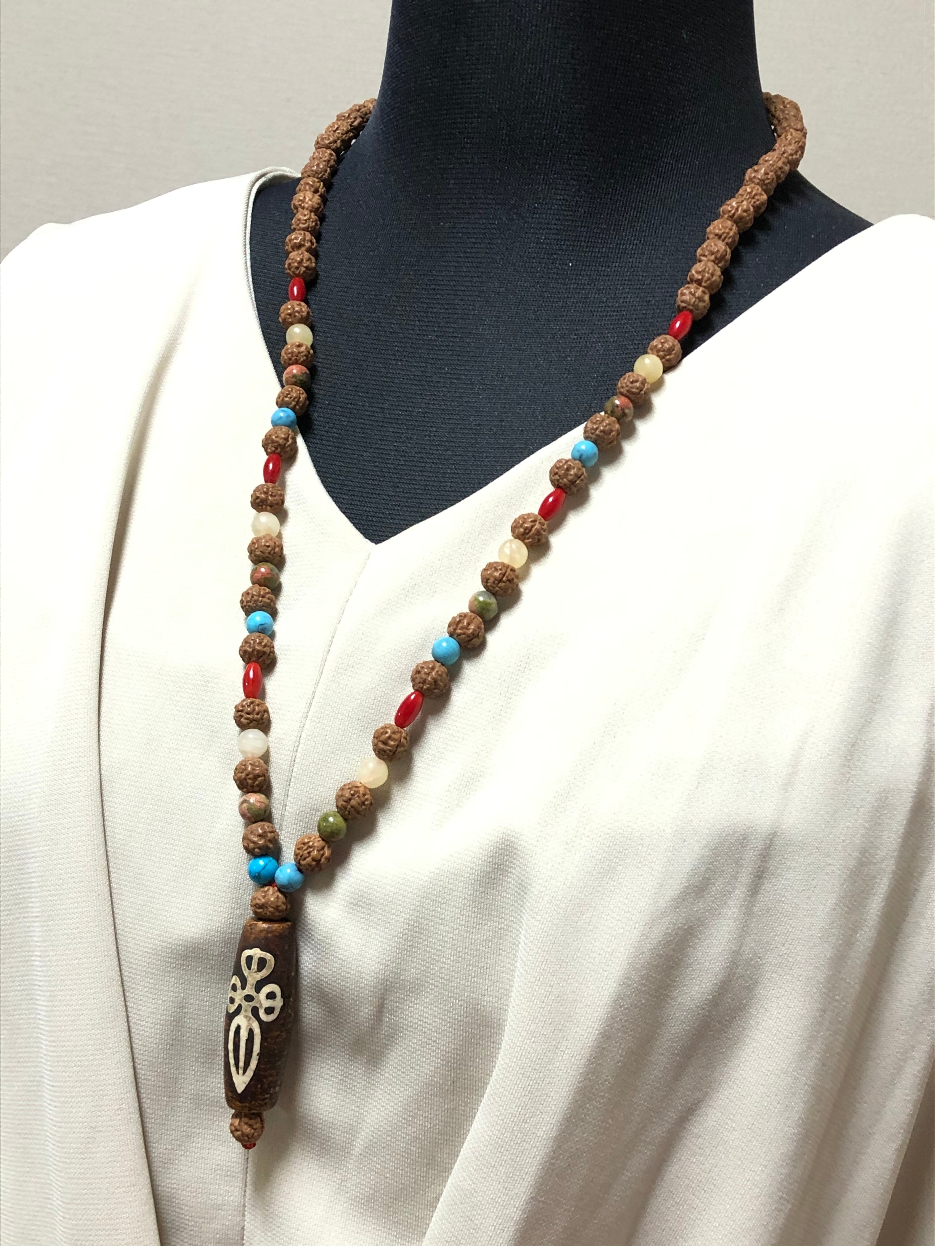 【インドネシア虹色ロングネックレス】天珠ヴァジュラ模様&金剛菩提樹 エスニック